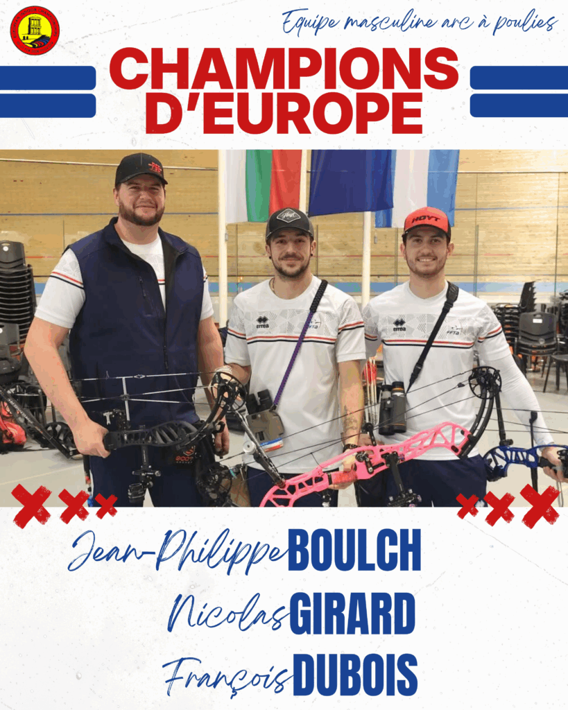 Lors des Championnats d’Europe en salle qui se déroulaient à Plovdiv (Bulgarie) du 14 au 21 février 2026, Jean-Philippe BOULCH a été sacré avec l’Equipe de France Arc à Poulies, en compagnie de Nicolas GIRARD et François DUBOIS. Félicitations !